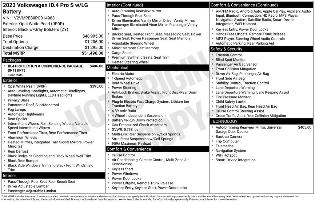Powered by a state-of-the-art electric motor and featuring a sleek, aerodynamic design, the ID.4 Pro S delivers an impressive 115 MPGe in the city and 98 MPGe on the highway. Experience the exhilaration of instant torque and the confidence of rear-wheel drive, all while enjoying the exceptional comfort and convenience of this cutting-edge electric SUV.